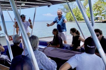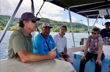- Présentation par Betty Tehei, Représentante des pêcheurs de l’A.M.E de Vahoata, de l’élevage d’holothuries géré par la Fédération des rahui et présentation des rahui de Teva I Uta par Tamatoa Bambridge, Directeur de recherche au CNRS © Guillaume Marchand